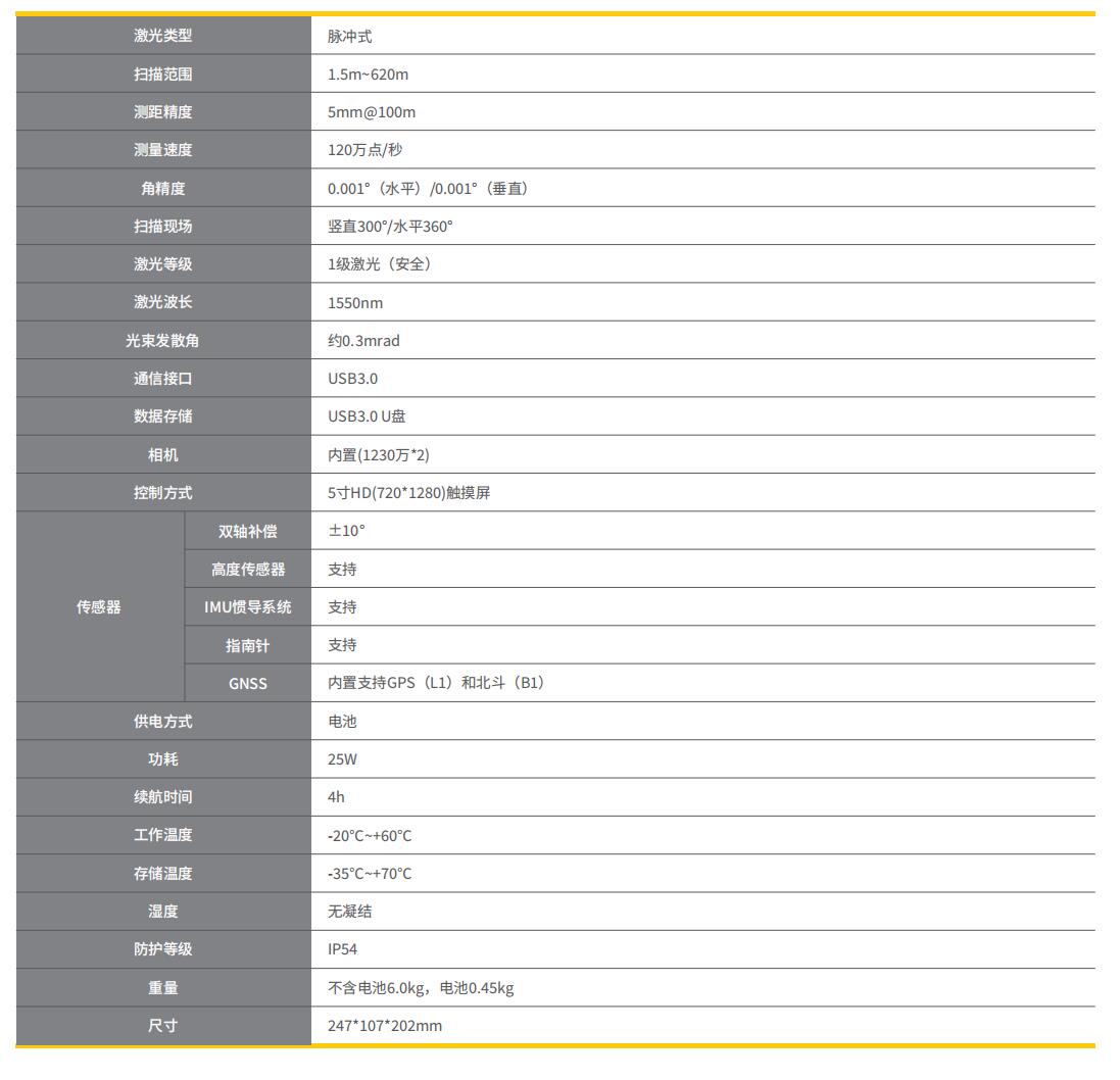 測(cè)程620m,測(cè)量速度可達(dá)120萬點(diǎn)/秒,測(cè)距精度≤5mm±100m。