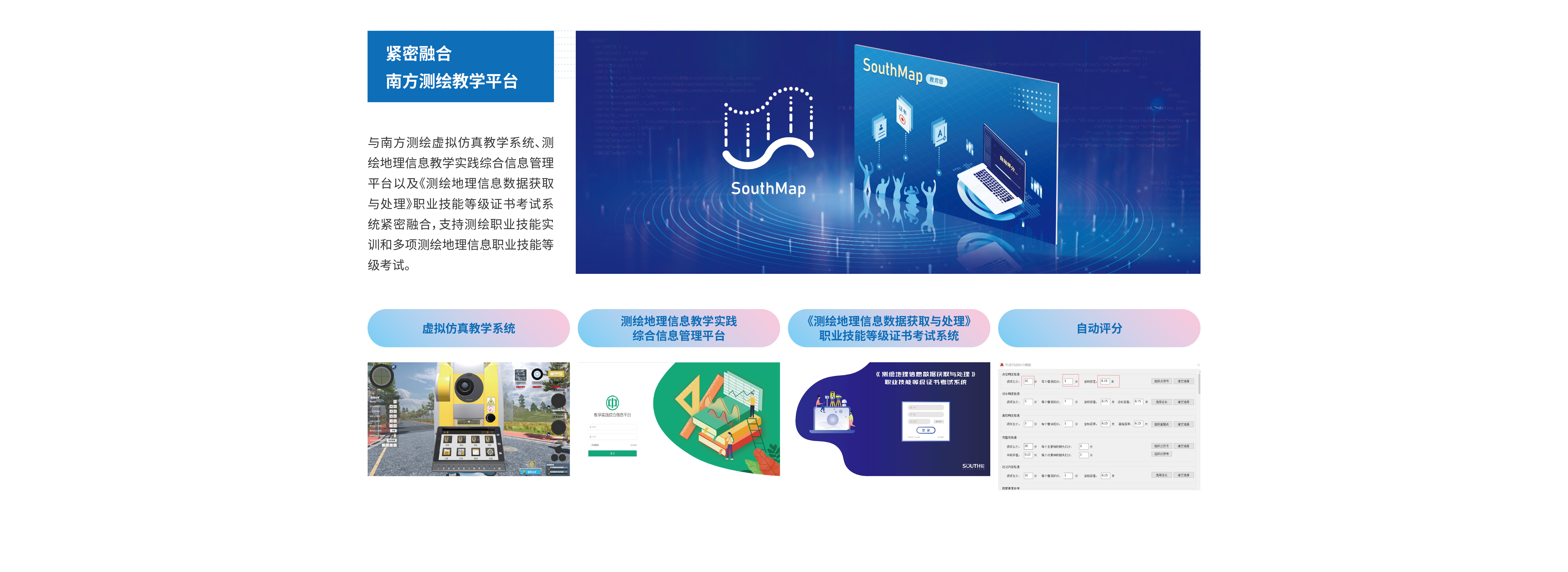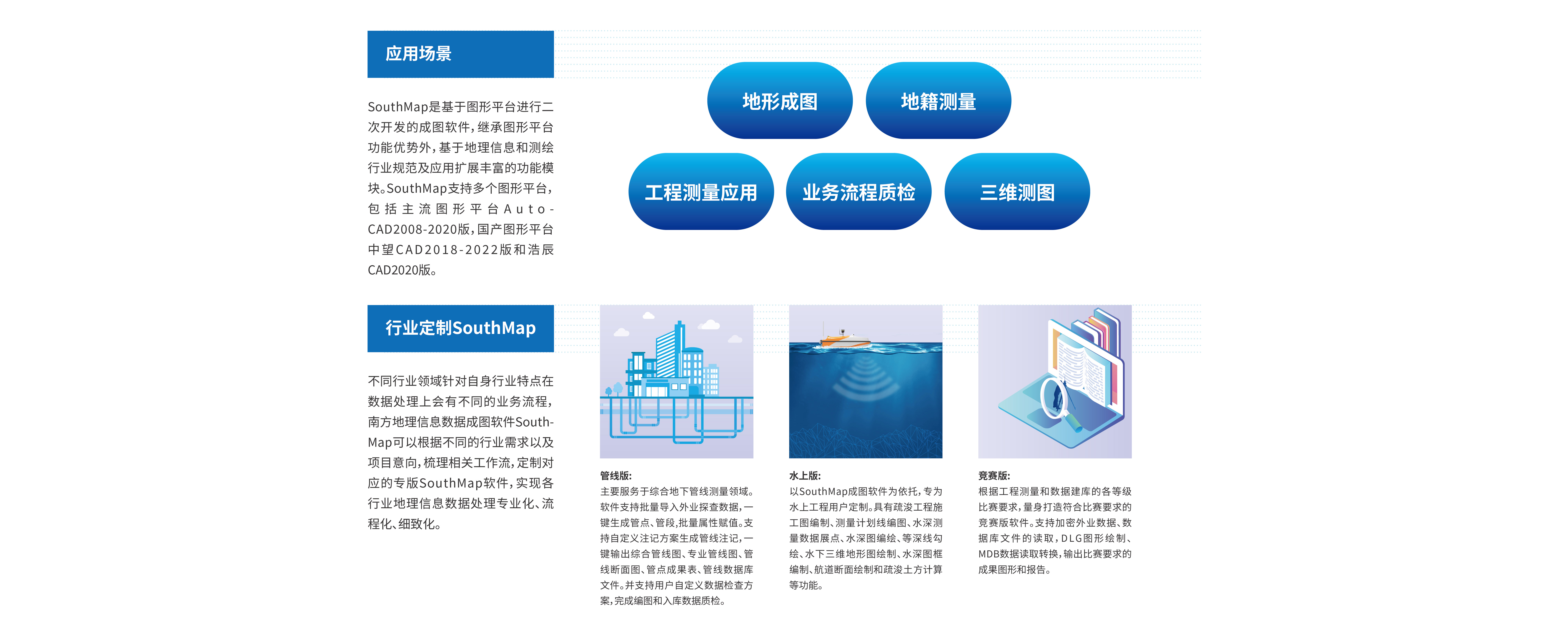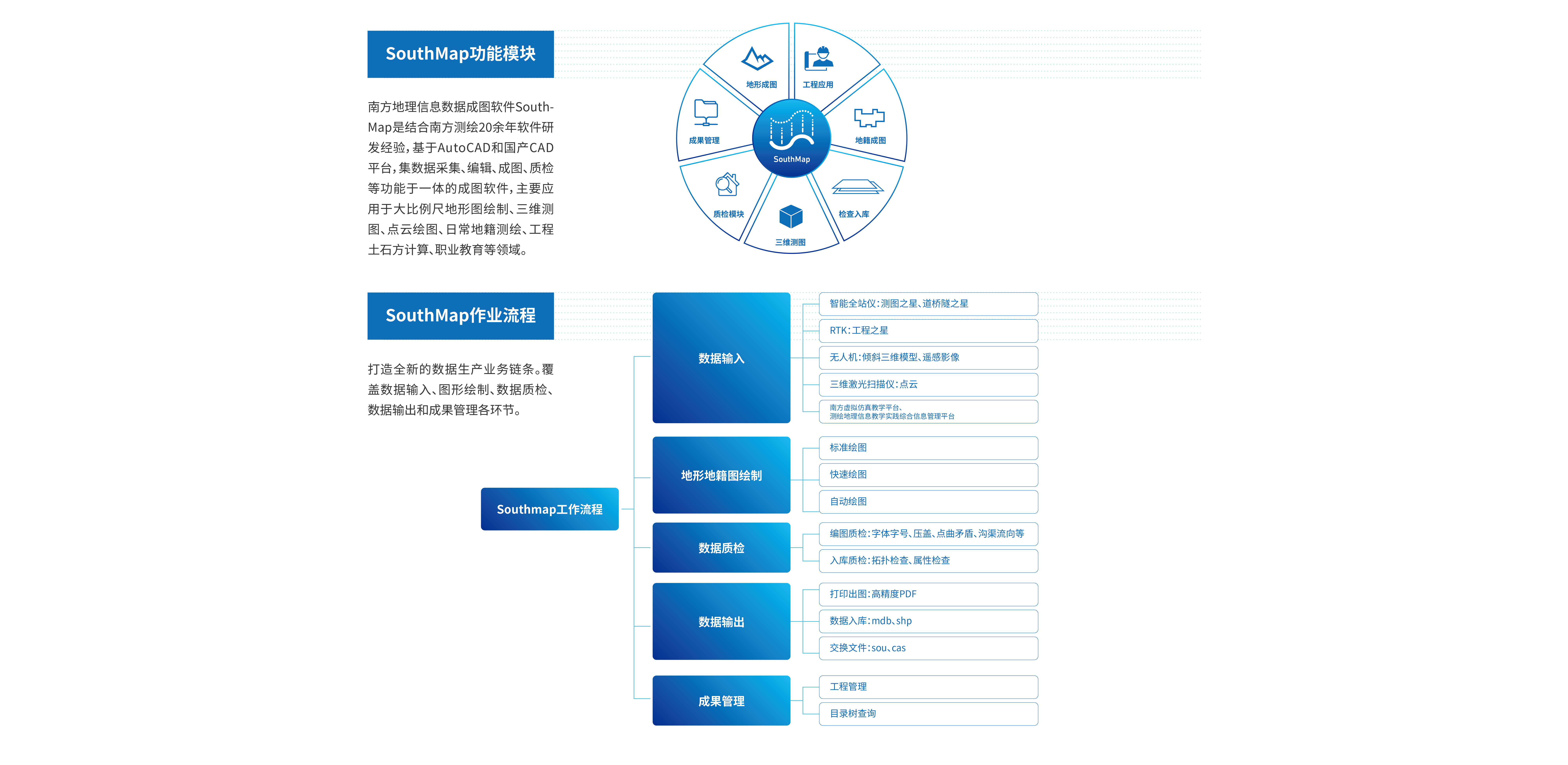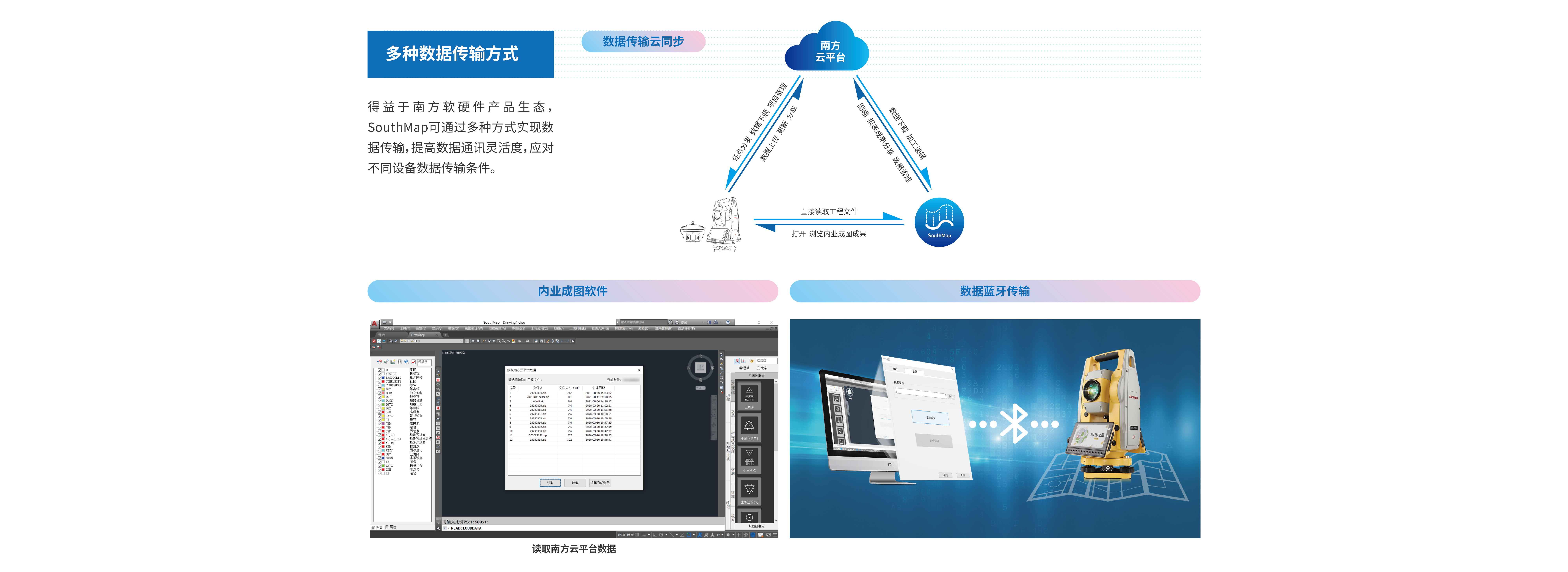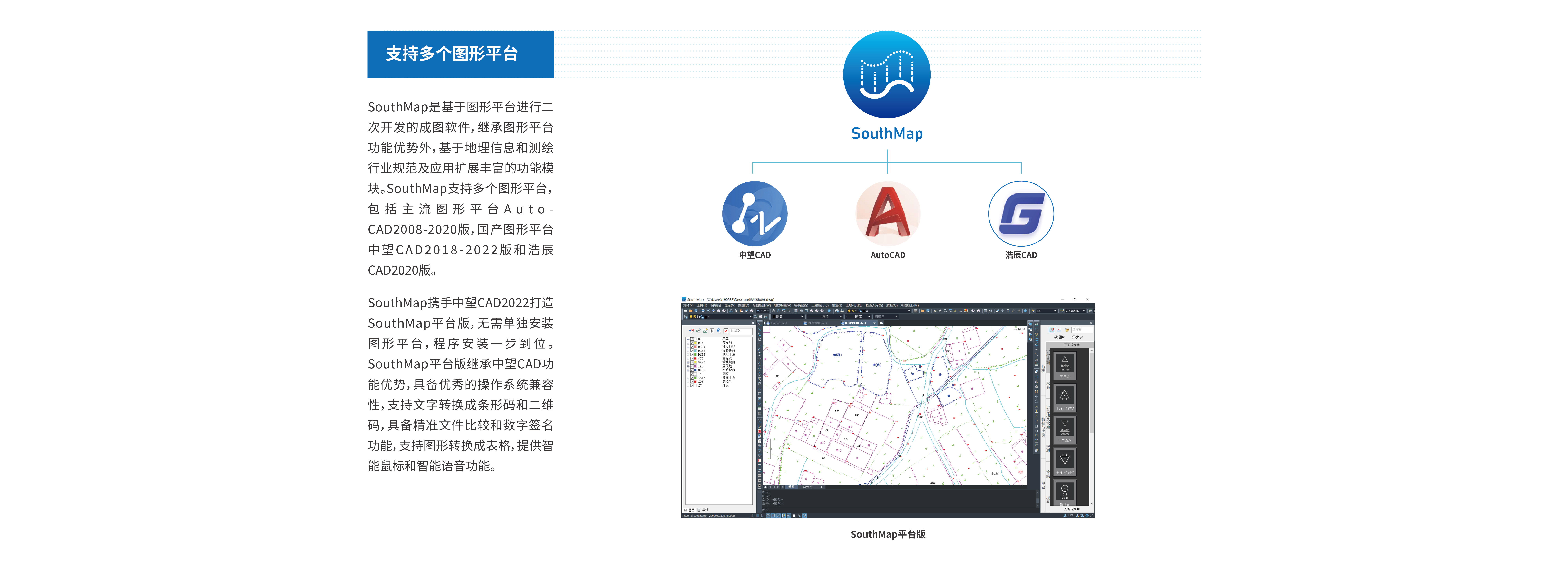 南方地理信息數(shù)據(jù)成圖軟件SouthMap是通過南方測繪20余年軟件研發(fā)經(jīng)驗,基于AutoCAD和國產(chǎn)CAD平臺,集數(shù)據(jù)采集、編輯、成圖、質(zhì)檢等功能于一體的成圖軟件,主要用于大比例尺地形圖繪制、三維測圖、點云繪圖、日常地籍測繪、工程土石方計算、職業(yè)教育等領(lǐng)域。